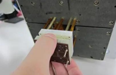 当社は、一般的なピン・スプリング構造の治具と比較して、ファインピッチ化と低価格化を実現しました。